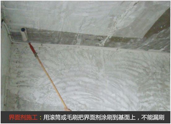 用滾筒或毛刷把界面劑漿料涂刷到基面上,不能漏刷。待水分揮發(fā),表面發(fā)黏、收漿,接近初凝,而后續(xù)材料可以壓入又不下滑,即可進行后續(xù)墻面材料粘附施工。