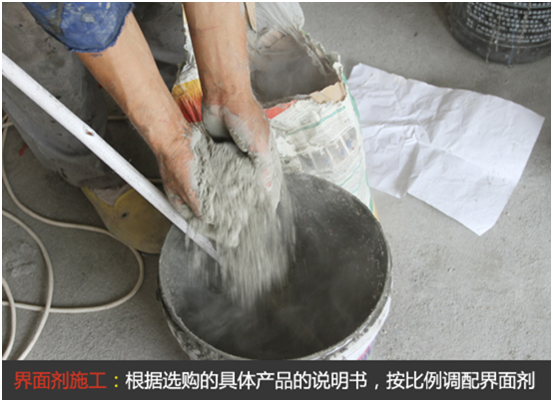 根據(jù)選購的具體界面劑產(chǎn)品說明,調(diào)配界面劑。一般干粉型界面劑的調(diào)配比例為每袋10公斤加2公斤清水,即“粉:水=1:0.2”。界面劑攪拌的時候最好使用電動設(shè)備進行攪拌,能夠更快的將之?dāng)嚢璩删鶆虻南{狀。